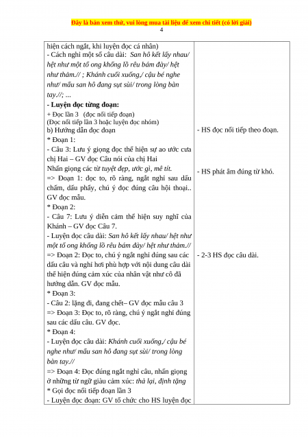 + Đoạn 3: Tiếp theo cho đến sụt sùi trong lòng bàn tay. + Đoạn 4: Còn lại. - Luyện đọc câu dài: + Đọc lần 2: - 2-3 HS đọc câu dài.