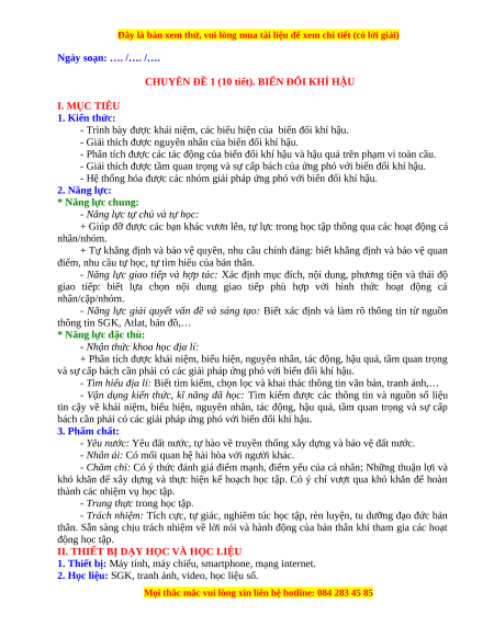 CHUYÊN ĐỀ 1 (10 tiết). BIẾN ĐỔI KHÍ HẬU I. MỤC TIÊU 1. Kiến thức: