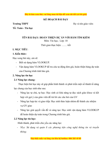 Đây là bản xem thử, vui lòng mua tài liệu để xem chi tiết (có lời giải) KẾ HOẠCH BÀI DẠY Trường THPT Họ và tên giáo viên: Tổ: Toán - Tin học