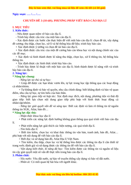 CHUYÊN ĐỀ 3 (10 tiết). PHƯƠNG PHÁP VIẾT BÁO CÁO ĐỊA LÍ I. MỤC TIÊU 1. Kiến thức:
