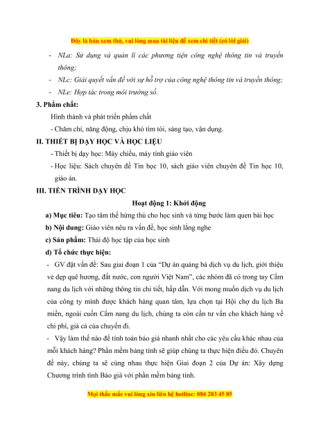- Học liệu: Sách chuyên đề Tin học 10, sách giáo viên chuyên đề Tin học 10, giáo án.