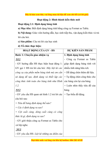 - GV hướng dẫn HS thực hiện hoạt động 1: giúp định dạng bảng tính với