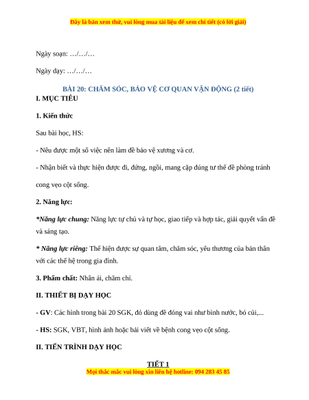 BÀI 20: CHĂM SÓC, BẢO VỆ CƠ QUAN VẬN ĐỘNG (2 tiết) I. MỤC TIÊU 1. Kiến thức Sau bài học, HS: