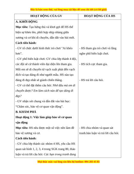 Giáo án Chăm sóc, bảo vệ cơ quan vận động TNXH lớp 2 Chân trời sáng tạo