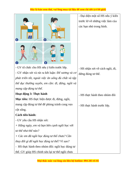 - Nhận biết và thực hiện được đi, đứng, ngồi, mang cặp đúng tư thế đề phòng tránh cong vẹo cột sống. 2. Năng lực: