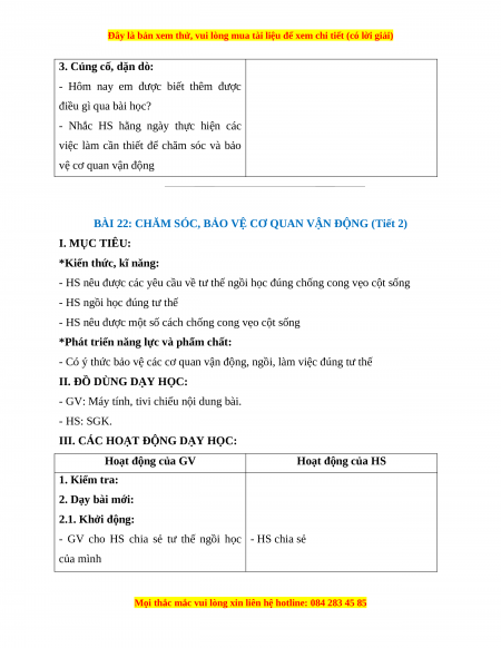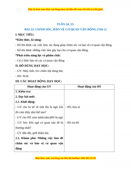 BÀI 22: CHĂM SÓC, BẢO VỆ CƠ QUAN VẬN ĐỘNG (Tiết 1) I. MỤC TIÊU: