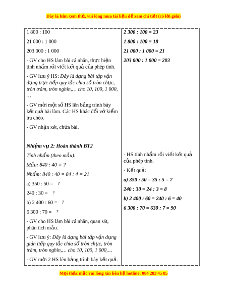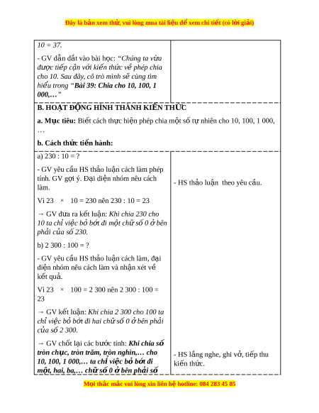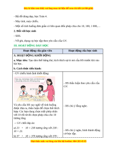 Đây là bản xem th , vu ử i lòng mua tài li u ệ đ xe ể m chi ti t (c ế ó l i ờ gi i ả ) - Bộ đồ dùng d y ạ , h c ọ Toán 4. - Máy tính, máy chi u. ế - M t ộ số tình huống đ n gi ơ n ả có liên quan đ n phép ế chia cho 10, 100, 1 000,… 2. Đ i ố v i ớ h c s ọ inh - SHS. - Vở ghi, d ng c ụ h ụ c ọ t p t ậ heo yêu c u c ầ a ủ GV. III. HOẠT Đ N Ộ G D Y Ạ H C Ọ Hoạt đ ng c ộ a gi ủ áo viên Hoạt đ ng c ộ a h ủ c s ọ inh A. HOẠT Đ N Ộ G KH I Ở Đ N Ộ G a. Mục tiêu: T o t ạ âm th h ế ng t ứ