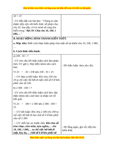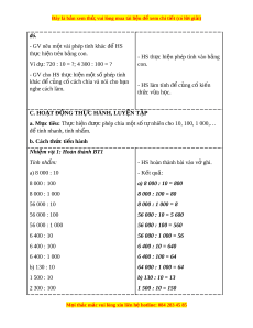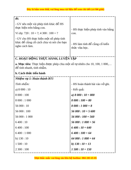 ủ cố cách chia và nói cho b n ạ - HS làm tính đ c ể ng c ủ ki ố n ế nghe cách làm. th c ứ v a h ừ c. ọ C. HOẠT Đ N Ộ G TH C Ự HÀNH, LUY N Ệ T P Ậ a. Mục tiêu: Th c ự hi n đ ệ ư c ợ phép chia m t ộ số t nhi ự ên cho 10, 100, 1 000,… đ t ể ính nhanh, tính nh m ẩ . b. Cách th c t ứ i n hành ế Nhi m ệ v 1