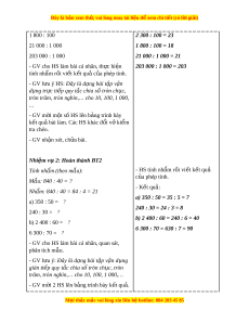 ẩ khi chia cho 10, 100, 1 000,… - Phát tri n năng ể l c gi ự i ả quy t ế v n đ ấ t ề oán h c, ọ năng l c t ự duy và l ư p ậ lu n ậ toán h c: ọ Thông qua vi c H ệ S bi t ế v n d ậ ng phép ụ chia m t ộ s t ố nhi ự ên cho 10, 100, 1 000,… đ gi ể i ả quy t ế v n đ ấ . ề - Phát tri n năng ể l c gi ự ao ti p t ế oán h c: ọ Thông qua vi c s ệ d ử ng ngôn ng ụ t ữ oán h c ọ đ di ể n t ễ cách ả tính, trao đ i ổ , chia sẻ nhóm. 2. Năng l c chung ự : - Năng l c t ự ch ự , ủ t h ự c: ọ l ng ắ nghe, tr l ả i ờ câu h i ỏ , làm bài t p. ậ - Năng l c gi ự i ả quy t ế v n đ ấ và s ề áng t o: ạ tham gia trò ch i ơ , v n d ậ ng, ụ sử d ng ụ các ki n t ế h c đã h ứ c ọ ng d ứ ng vào t ụ h c t ự , ế tìm tòi, phát hi n gi ệ i ả quy t ế các nhiệm v t ụ rong cu c s ộ ống. - Năng l c gi ự ao ti p và ế h p t ợ ác: ho t ạ đ ng ộ nhóm. 3. Phẩm ch t ấ : - Chăm ch : ỉ Chăm h c, ham ọ h c, ọ có tinh th n t ầ h ự c; ọ ch u khó đ ị c s ọ ách giáo khoa, tài li u và t ệ h c ự hi n các ệ nhi m ệ vụ cá nhân. - Trung th c: ự trung th c t ự rong th c hi ự n gi ệ i ả bài t p, ậ th c hi ự n nhi ệ m ệ v , ụ ghi chép và rút ra k t ế lu n. ậ - Yêu thích môn h c, s ọ áng t o, có ạ ni m ề h ng t ứ hú, say mê các con s đ ố gi ể i ả quy t ế bài toán. - Rèn luy n t ệ ính c n t ẩ h n, chí ậ nh xác, phát huy ý th c ch ứ đ ủ ng, ộ trách nhi m ệ và bồi dư ng s ỡ ự t t ự in, h ng t ứ hú trong vi c h ệ c. ọ II. Đ D Ồ ÙNG D Y Ạ H C Ọ 1. Đ i ố v i ớ giáo viên - Giáo án. M i