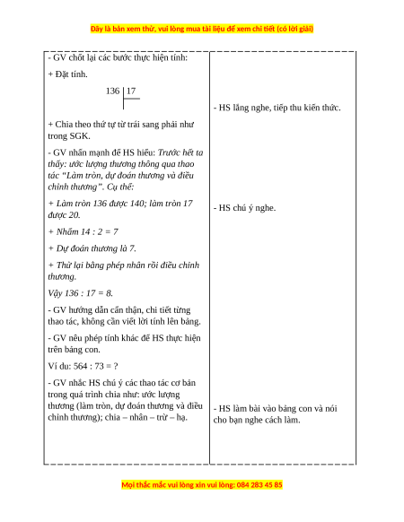 GV viết phép tính 136 : 17 = ? và yêu cầu