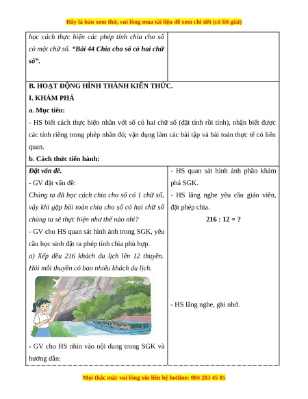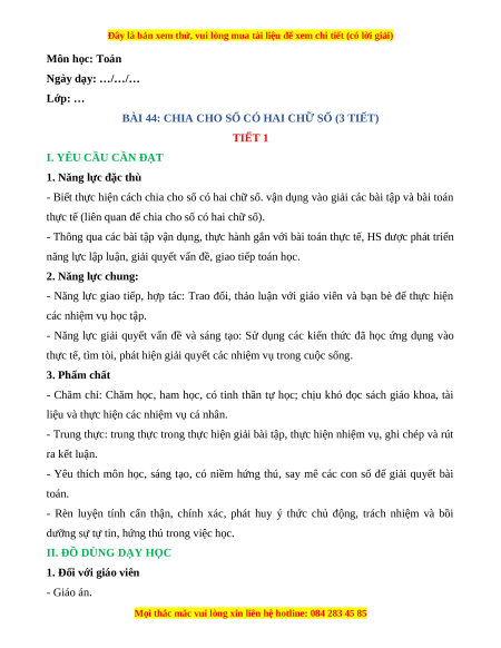 BÀI 44: CHIA CHO SỐ CÓ HAI CHỮ SỐ (3 TIẾT)