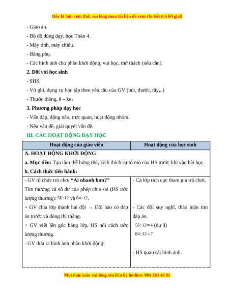 - Bộ đồ dùng dạy, học Toán 4. - Máy tính, máy chiếu. - Bảng phụ.