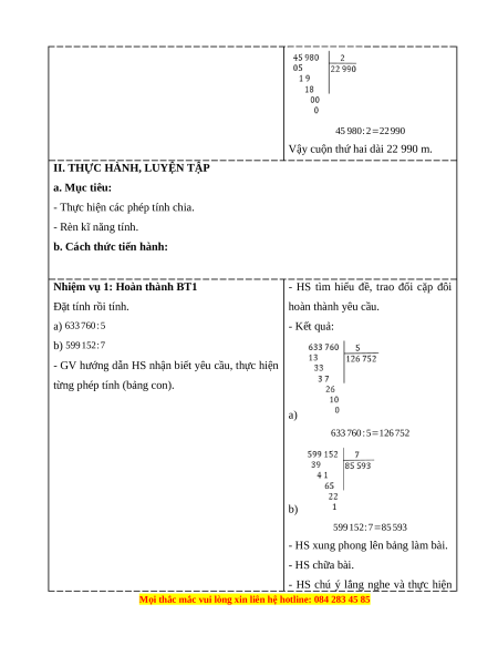 a. Mục tiêu: HS thực hiện được phép chia cho số có một chữ số.