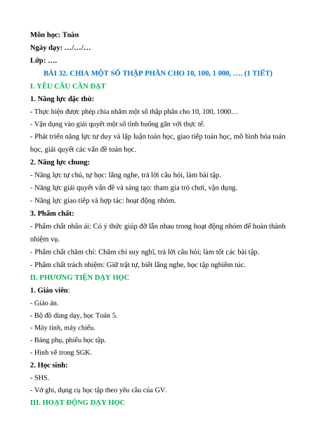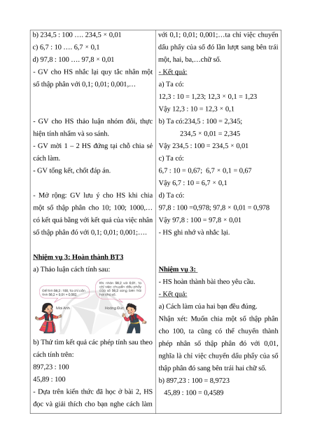 Giáo án Chia một số thập phân cho 10, 100, 1000, … Toán lớp 5 Cánh diều