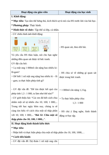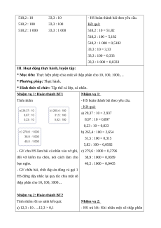 - Nhận biết và thực hiện phép chia một số thập phân cho 10, 100, 1000,… * Cách tiến hành: