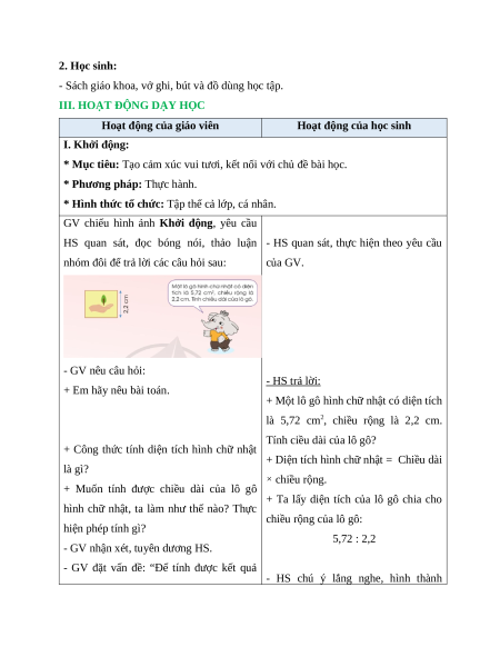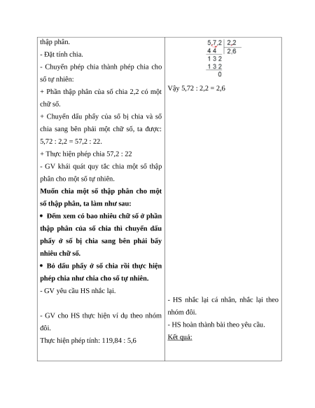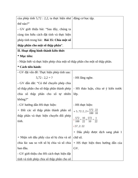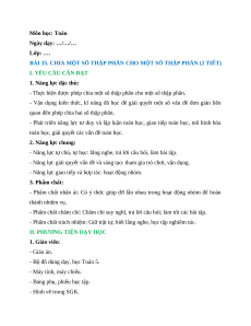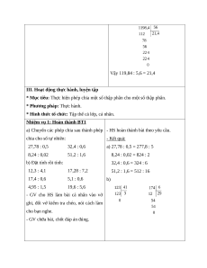 - Nhận biết và thực hiện phép chia một số thập phân cho một số thập phân. * Cách tiến hành: