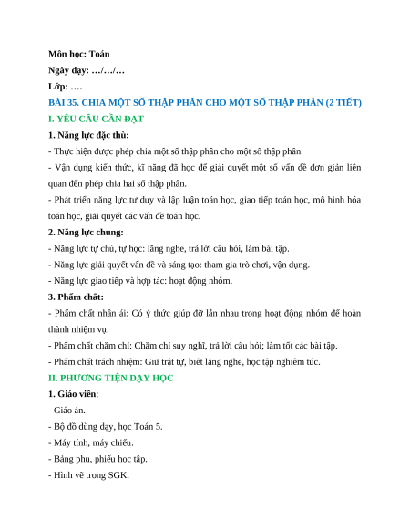 Giáo án Chia một số thập phân cho một số thập phân Toán lớp 5 Cánh diều
