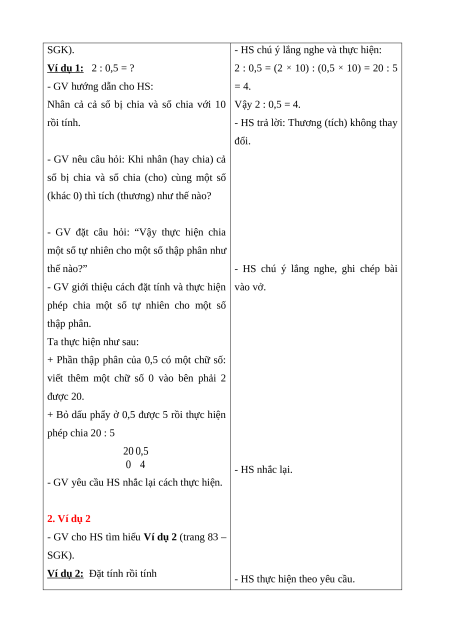 2 : 0,5 = (2 × 10) : (0,5 × 10) = 20 : 5 - GV hướng dẫn cho HS: = 4.