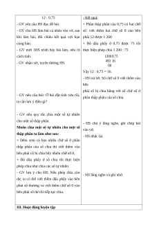 - GV mời 1HS trình bày bài làm, nêu rõ thực hiện phép chia 1 200 : 75 cách tính. 1200 0,75