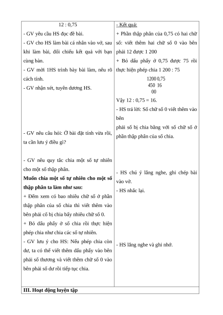 - HS thực hiện theo yêu cầu. 12 : 0,75 - Kết quả: