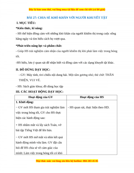 BÀI 27: CHIA SẺ KHÓ KHĂN VỚI NGƯỜI KHUYẾT TẬT I. MỤC TIÊU: