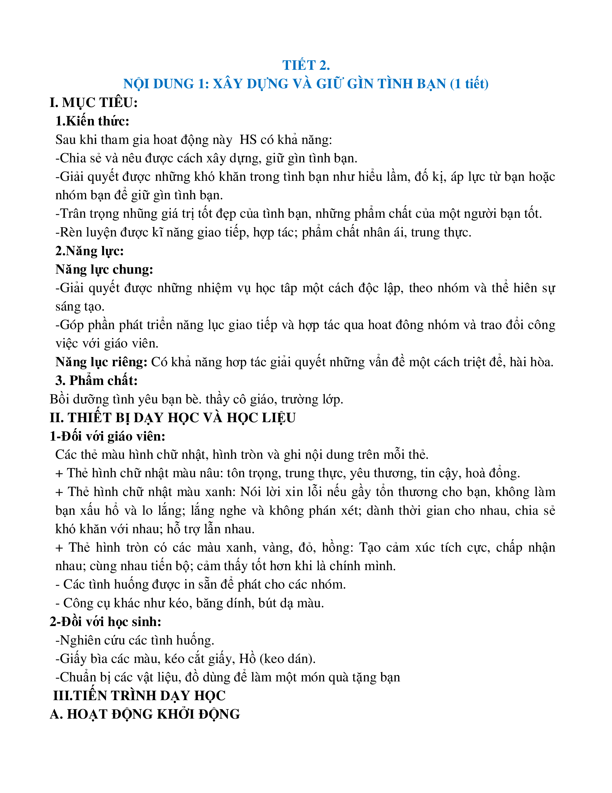 NỘI DUNG 1: XÂY DỰNG VÀ GIỮ GÌN TÌNH BẠN (1 tiết) I. MỤC TIÊU: 1.Kiến thức: