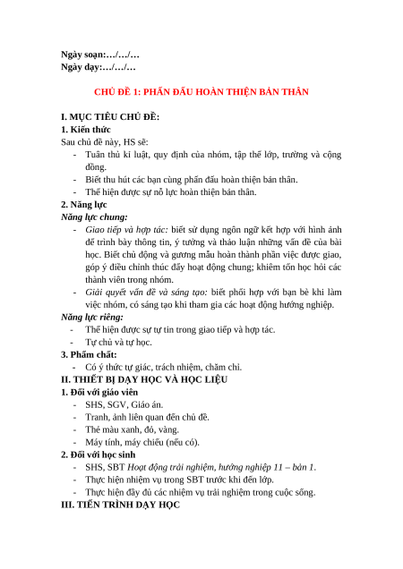 Giáo án Chủ đề 1: Phấn đấu hoàn thiện bản thân HĐTN 11 Chân trời sáng tạo
