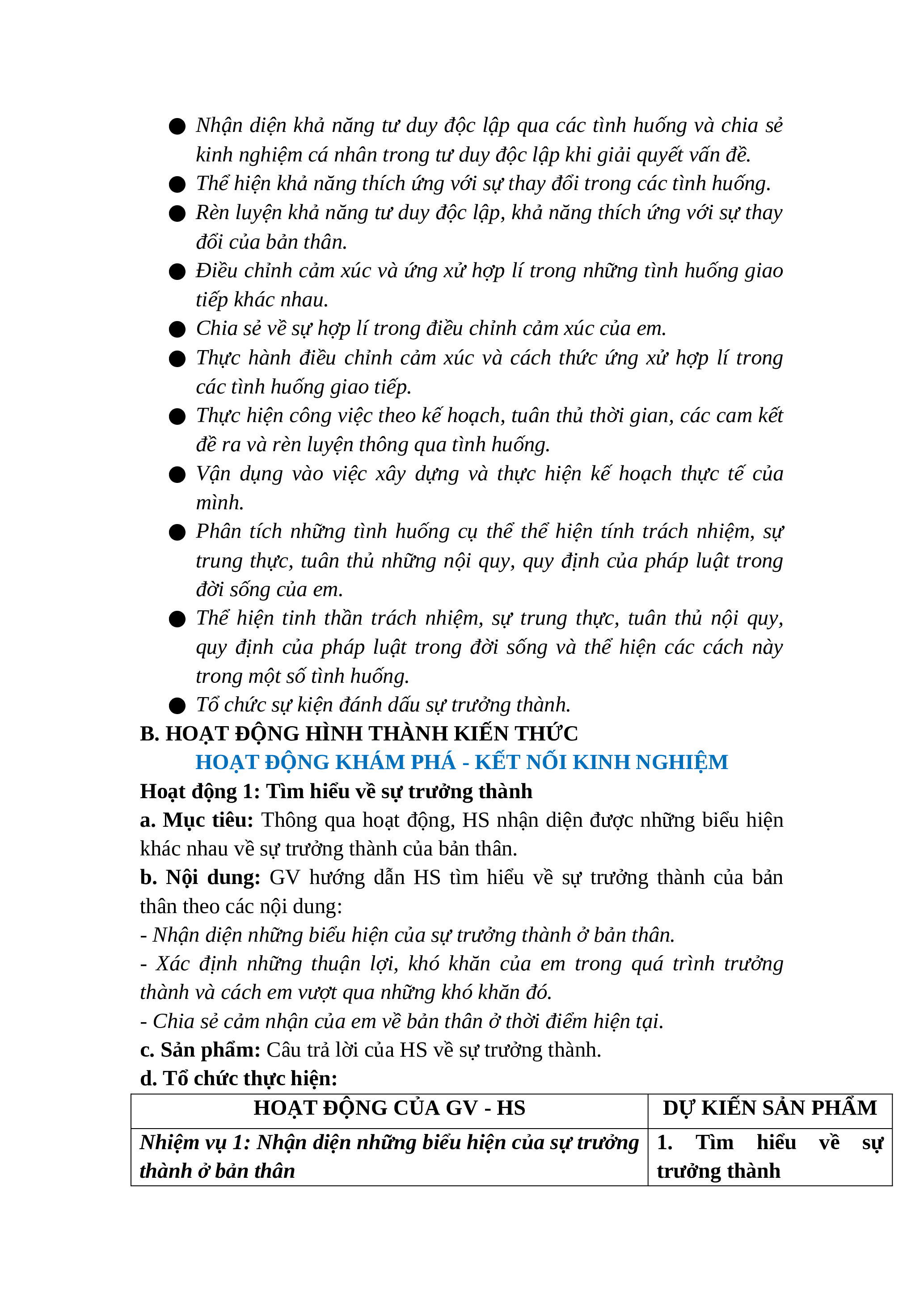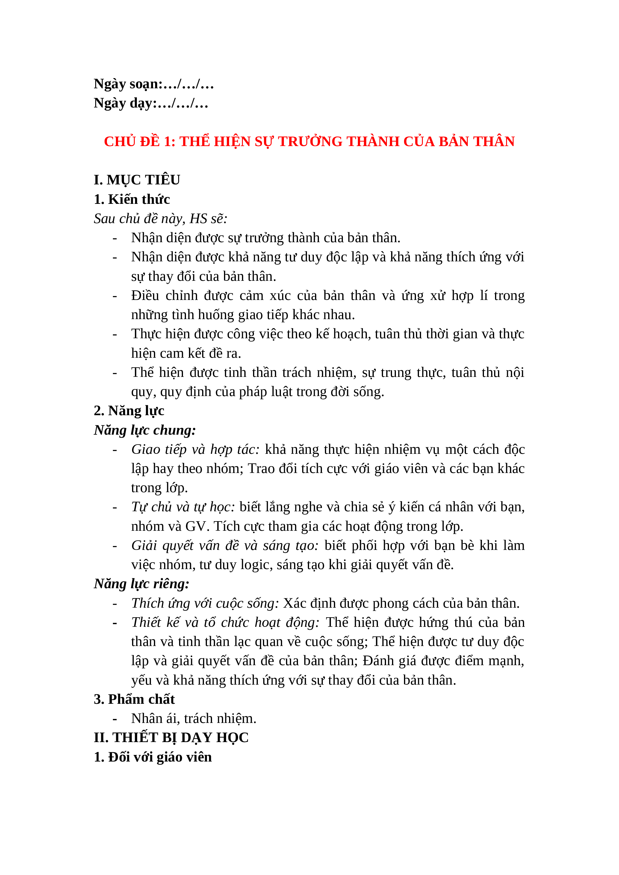 CHỦ ĐỀ 1: THỂ HIỆN SỰ TRƯỞNG THÀNH CỦA BẢN THÂN I. MỤC TIÊU 1. Kiến thức