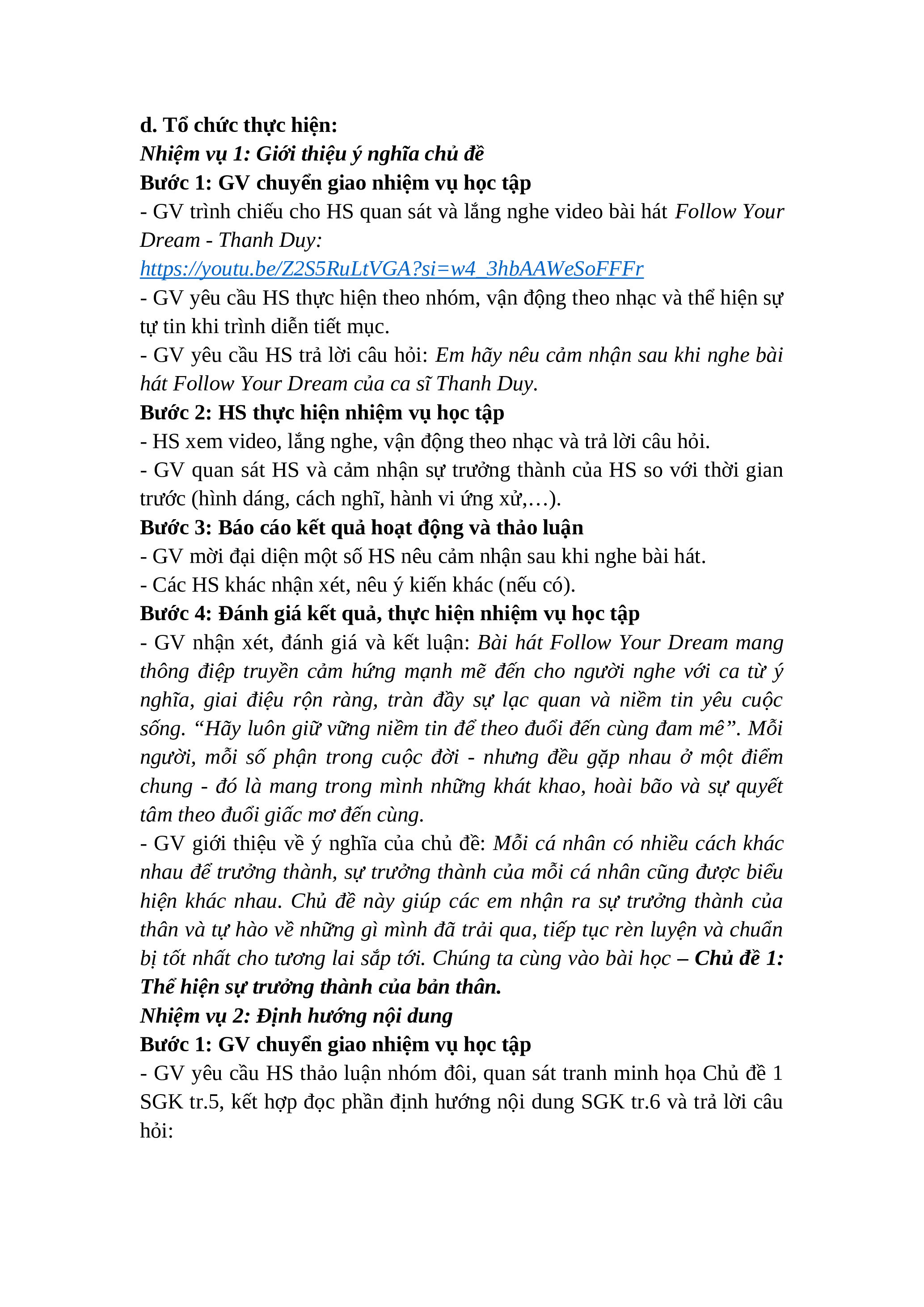 - GV trình chiếu cho HS quan sát và lắng nghe video bài hát Follow Your Dream - Thanh Duy: