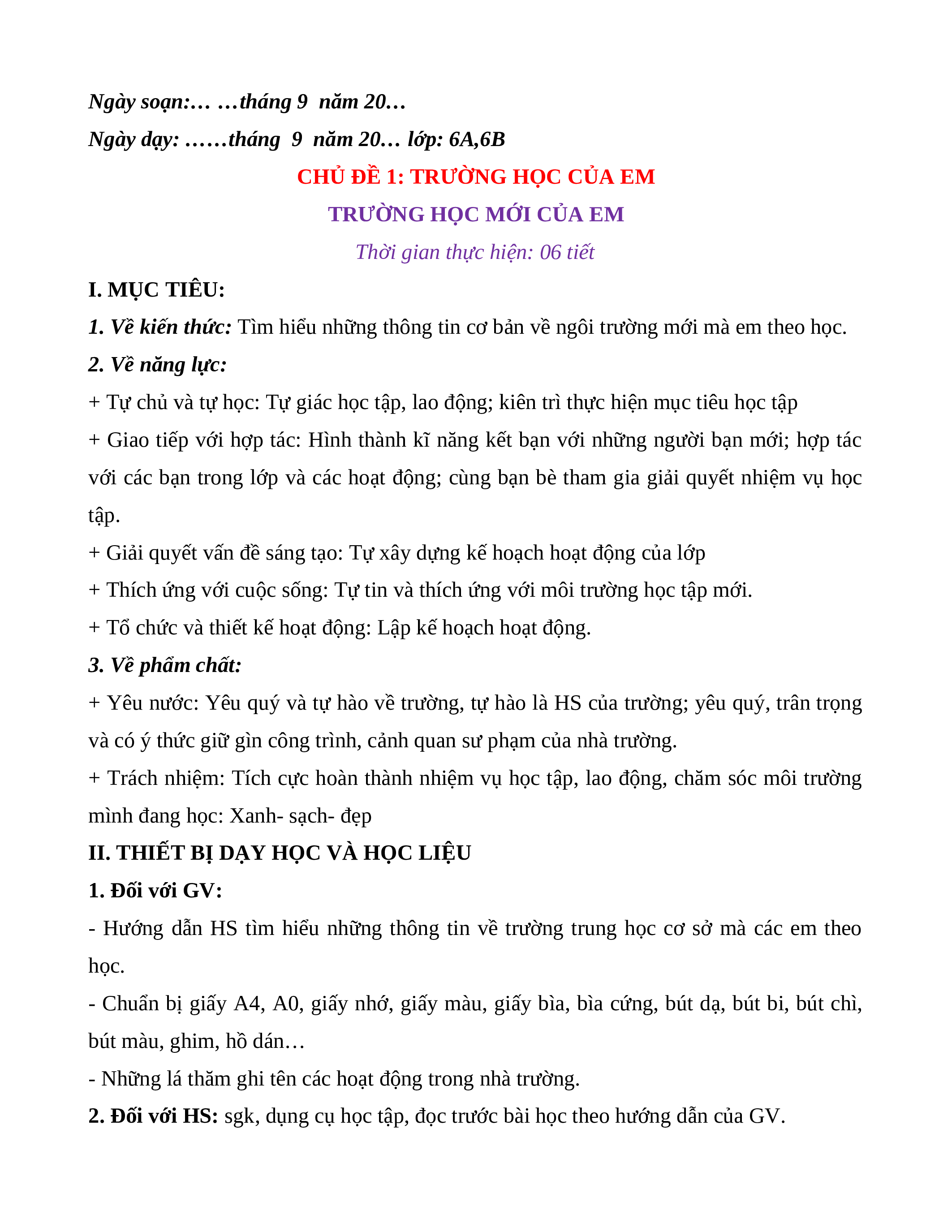 Ngày dạy: ……tháng 9 năm 20… lớp: 6A,6B
