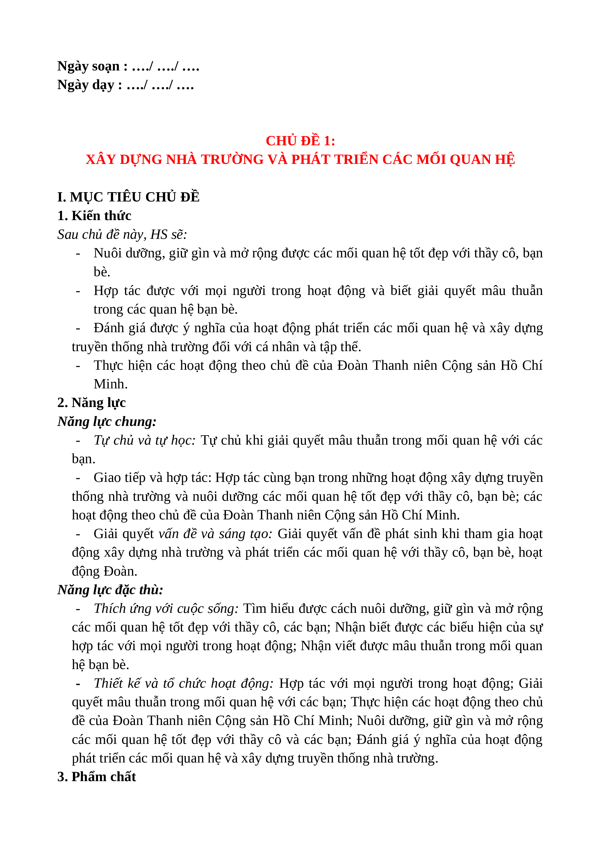 nay – Chủ đề 1: Xây dựng nhà trường và phát triển các mối quan hệ.