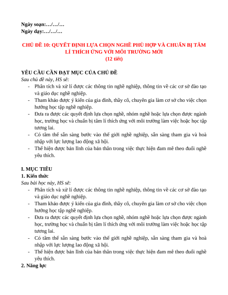 CHỦ ĐỀ 10: QUYẾT ĐỊNH LỰA CHỌN NGHỀ PHÙ HỢP VÀ CHUẨN BỊ TÂM