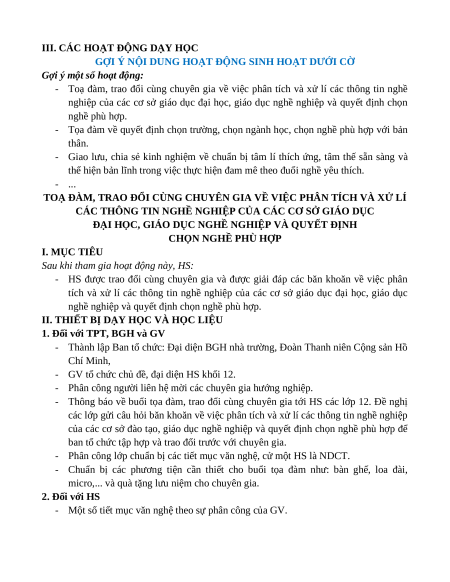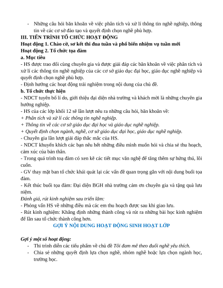 - Thông báo về buổi tọa đàm, trao đổi cùng chuyên gia tới HS các lớp 12. Đề nghị