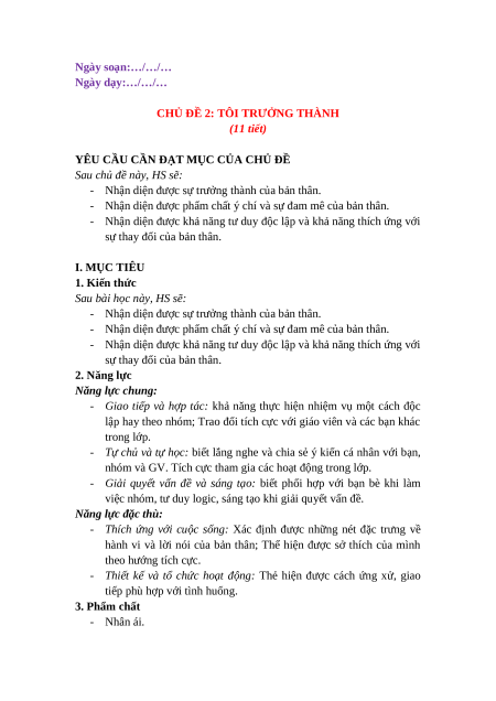CHỦ ĐỀ 2: TÔI TRƯỞNG THÀNH (11 tiết)