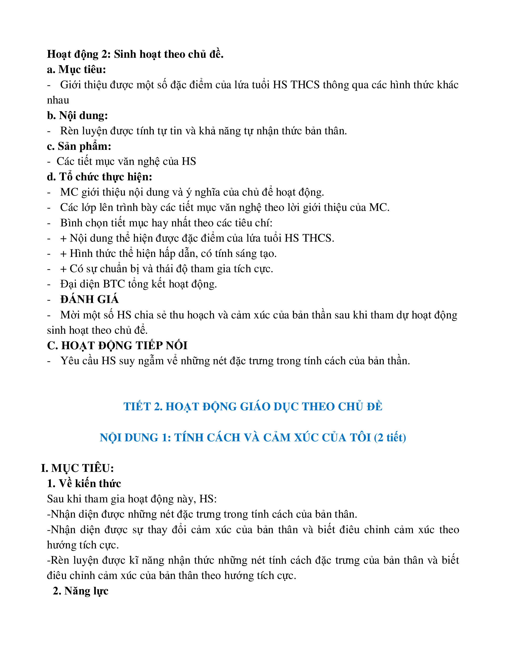 NỘI DUNG 1: TÍNH CÁCH VÀ CẢM XÚC CỦA TÔI (2 tiết) I. MỤC TIÊU: 1. Về kiến thức