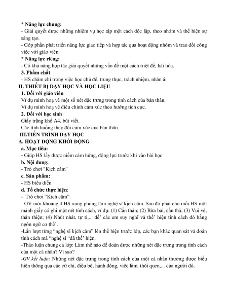 điêu chỉnh cảm xúc của bản thân theo hướng tích cực. 2. Năng lực * Năng lực chung:
