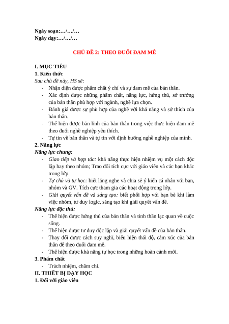 CHỦ ĐỀ 2: THEO ĐUỔI ĐAM MÊ I. MỤC TIÊU 1. Kiến thức