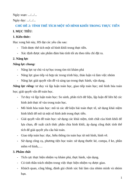 CHỦ ĐỀ 2: TÍNH THỂ TÍCH MỘT SỐ HÌNH KHỐI TRONG THỰC TIỄN I. MỤC TIÊU: