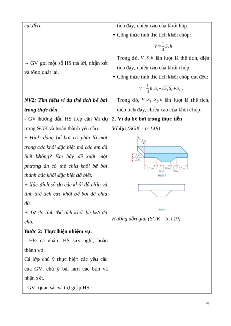 NV2: Tìm hiểu ví dụ thể tích bể bơi Trong đó, V ,S , S ,h 1 2