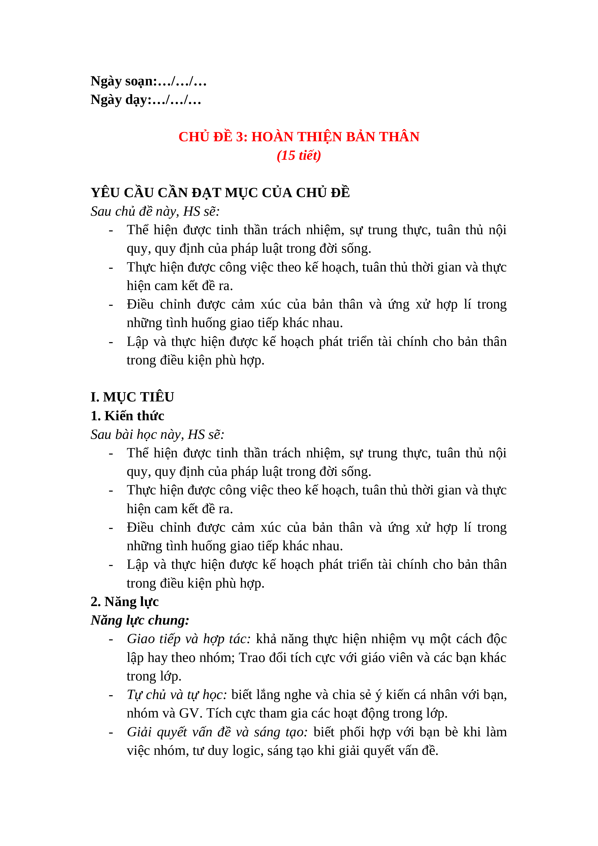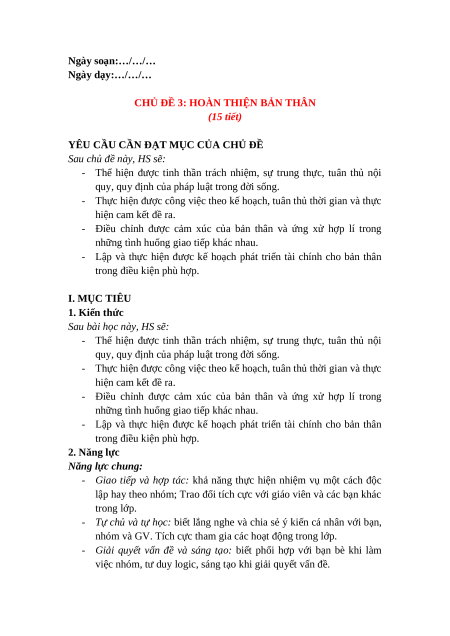 CHỦ ĐỀ 3: HOÀN THIỆN BẢN THÂN (15 tiết)