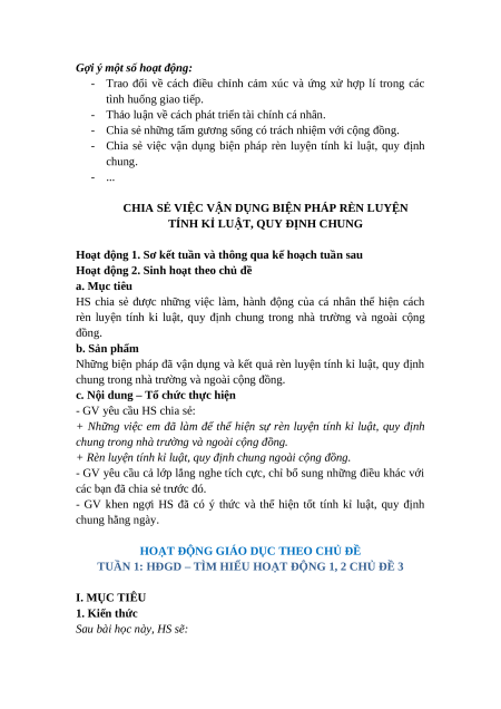 GỢI Ý NỘI DUNG HOẠT ĐỘNG SINH LỚP