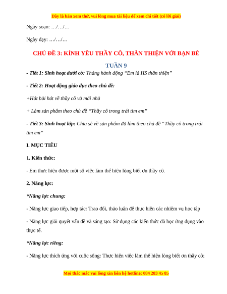 CHỦ ĐỀ 3: KÍNH YÊU THẦY CÔ, THÂN THIỆN VỚI BẠN BÈ TUẦN 9