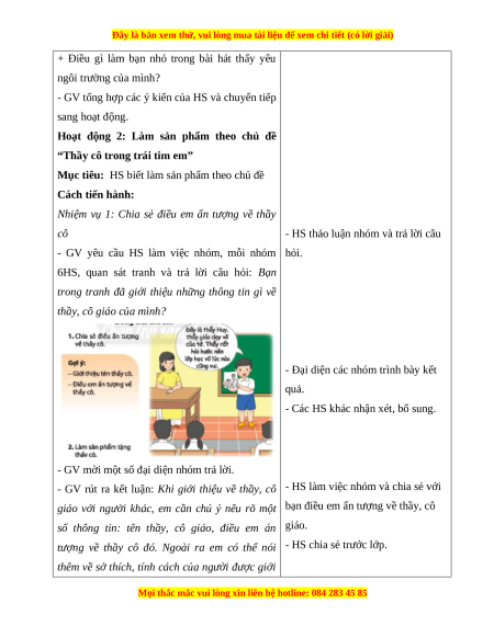 - Cuối mỗi tiết hoạt động, GV nên nhắc lại những điều HS cần chuẩn bị cho tiết hoạt