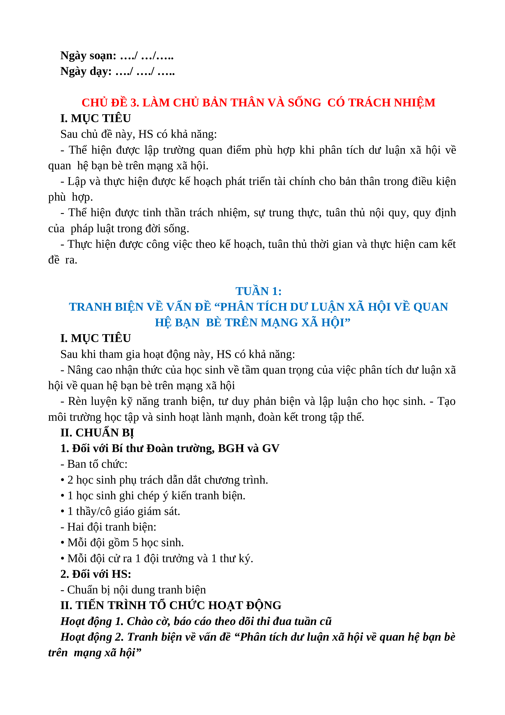 CHỦ ĐỀ 3. LÀM CHỦ BẢN THÂN VÀ SỐNG CÓ TRÁCH NHIỆM I. MỤC TIÊU
