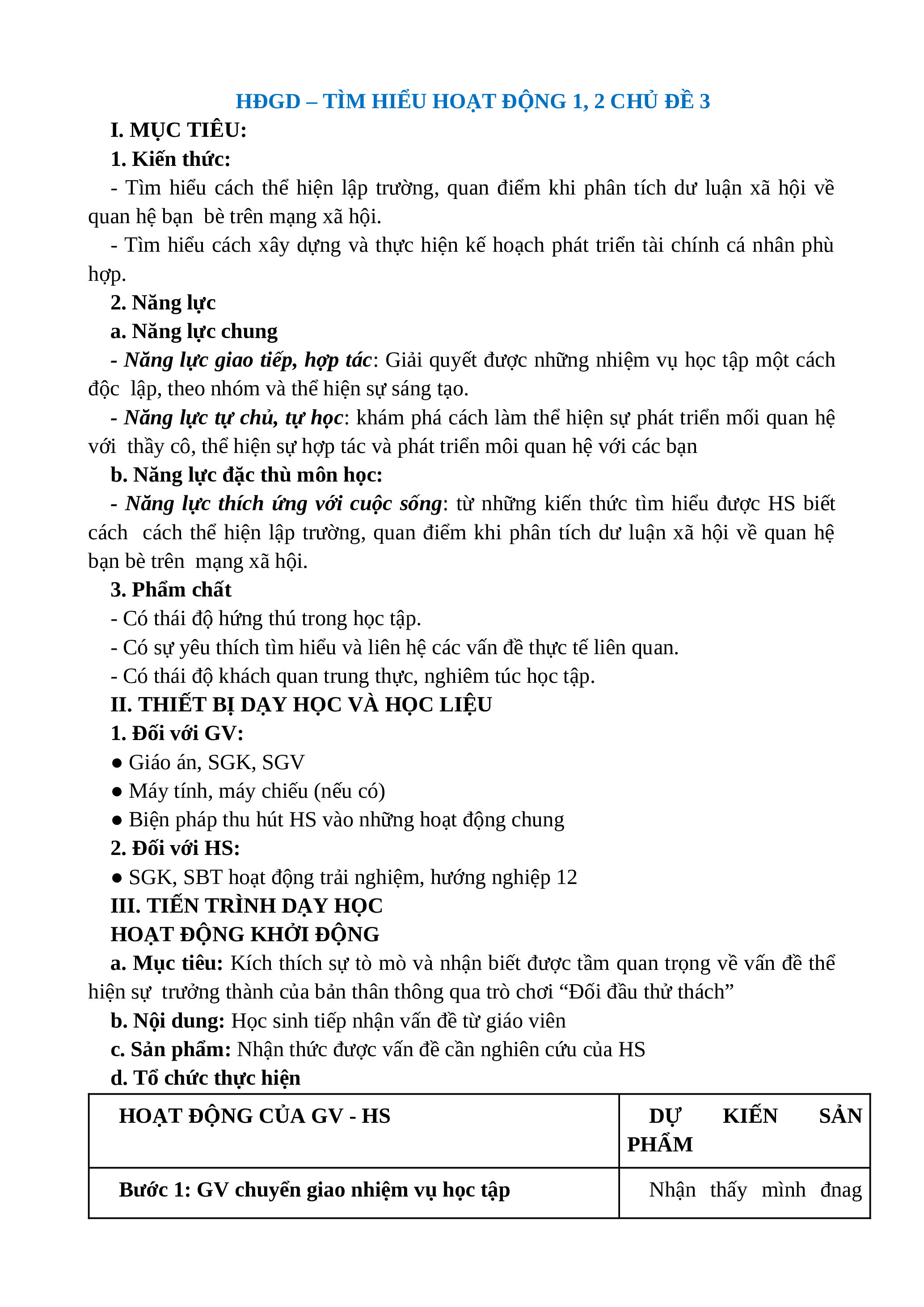 HĐGD – TÌM HIỂU HOẠT ĐỘNG 1, 2 CHỦ ĐỀ 3 I. MỤC TIÊU: 1. Kiến thức: