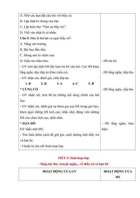 Giáo án Chủ đề 3: Tri ân thầy cô. Kết nối bạn bè HĐTN lớp 5 Chân trời sáng tạo (Bản 1)