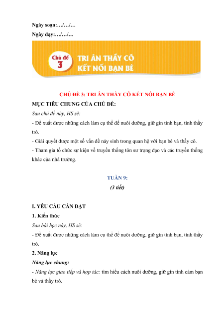 - Tham gia tổ chức sự kiện về truyền thống tôn sư trọng đạo và các truyền thống khác của nhà trường. TUẦN 9: (3 tiết) I. YÊU CẦU CẦN ĐẠT 1. Kiến thức