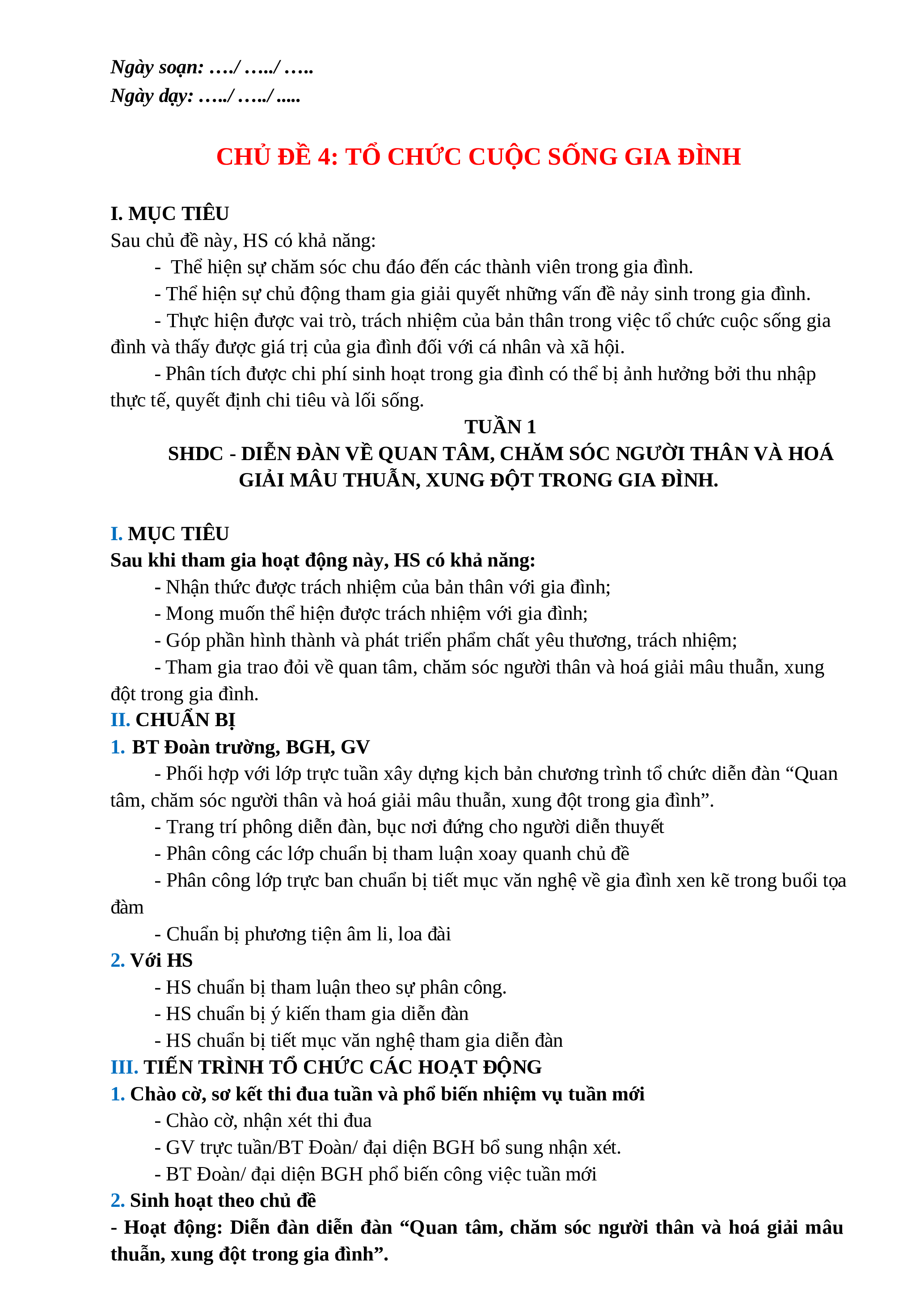 CHỦ ĐỀ 4: TỔ CHỨC CUỘC SỐNG GIA ĐÌNH I. MỤC TIÊU