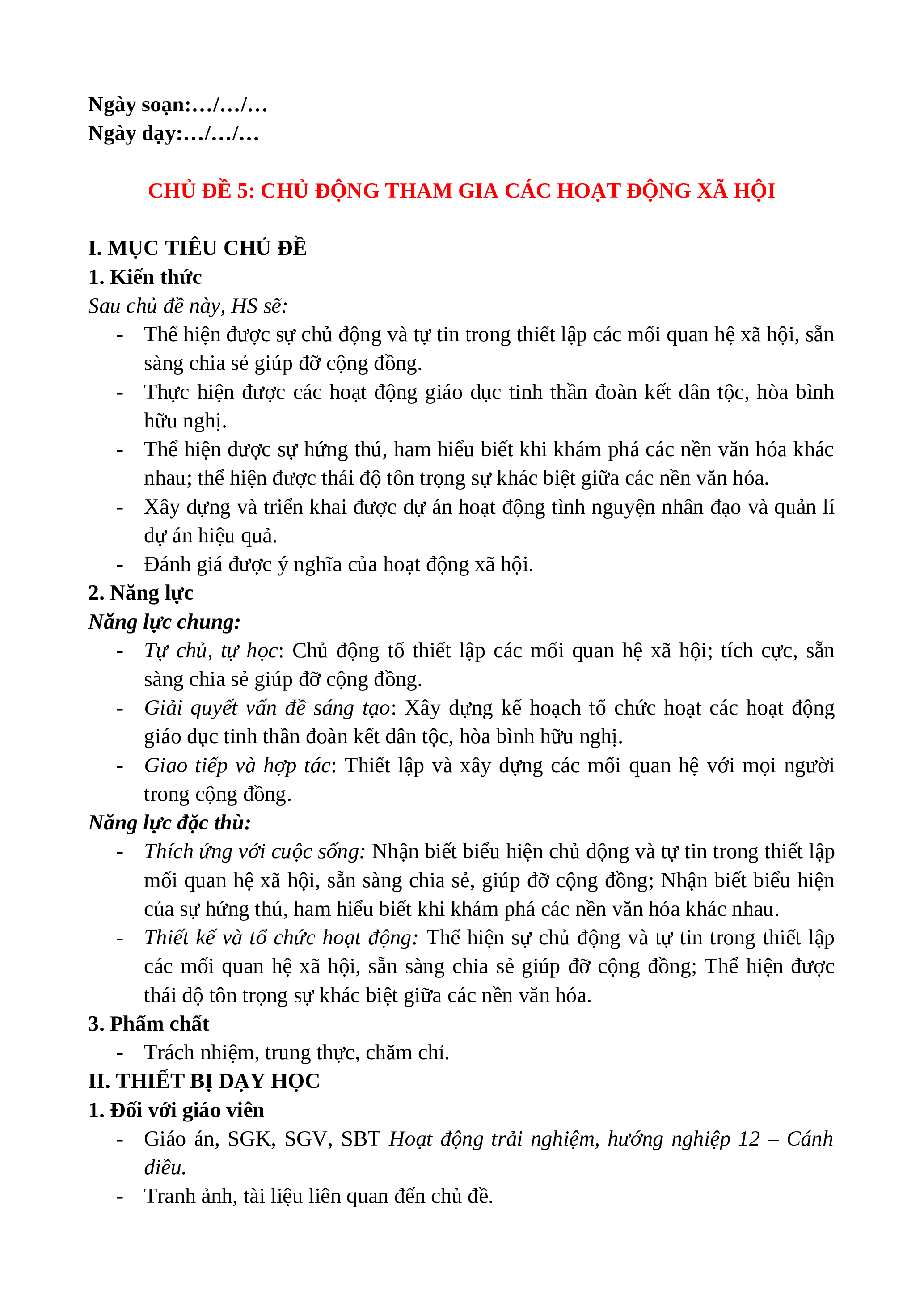 Giáo án Chủ đề 5: Chủ động tham gia các hoạt động xã hội HĐTN 12 Cánh diều
