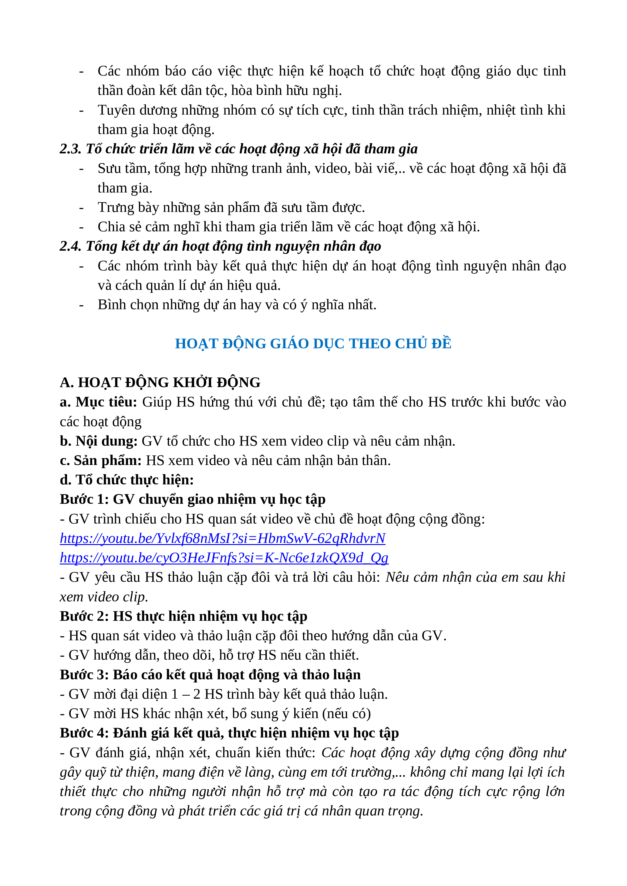 GỢI Ý NỘI DUNG HOẠT ĐỘNG SINH LỚP